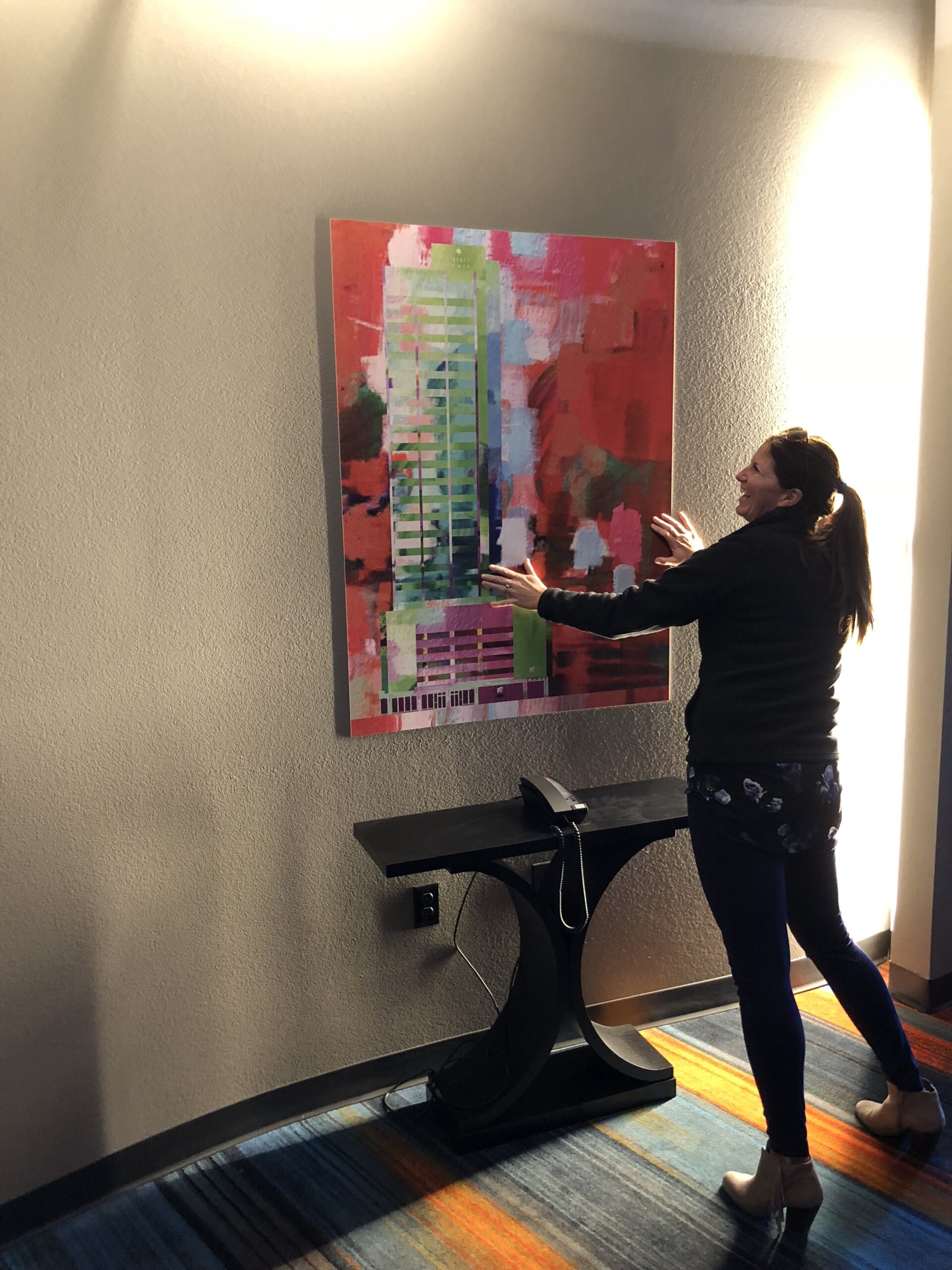 Το πορτραίτο παράχθηκε σε 10 πίνακες καμβά και τοποθετήθηκε σε κάθε ένα από τους ορόφους του ξενοδοχείου “aloft” που υπάρχει μέσα στο κτίριο.